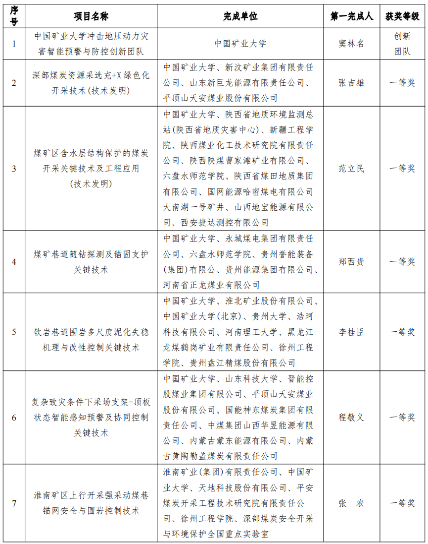 2024年11月28日至29日,煤炭行业科技创新成果总结与新技术交流会在福建厦门召开,会上中国煤炭工业协会对2024年度中国煤炭工业协会科学技术奖获奖项目进行了表彰。我院共有38项科技项目和1个创新团队获奖,其中我院教师以第一完成人荣获一等奖6项;窦林名教授牵头的“熟女av 冲击地压动力灾害智能预警与防控创新团队”荣获创新团队奖。