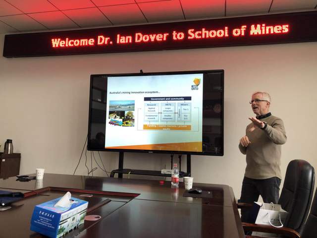 Ian Dover博士介绍了关于澳大利亚在矿业领域内的科研管理、科技转化、基金资助等方面的内容,并就科研合作、基金申请科技转化方面和矿业学院老师进行了深入交流。