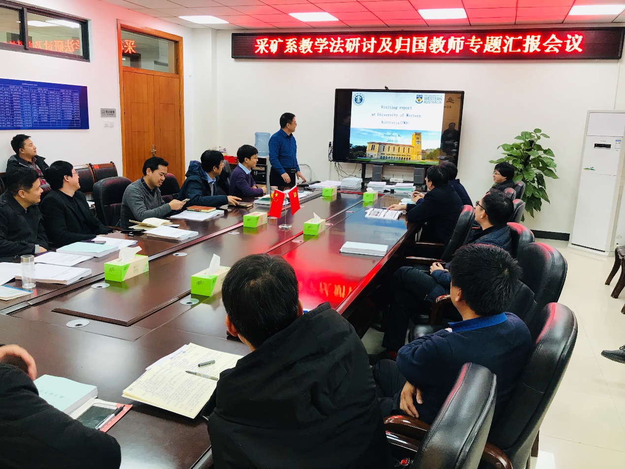 12月12日下午,采矿工程系在矿业学院A509召开教学法研讨及归国教师专题汇报会,全系在校教职工30余人参加了会议。会议由采矿工程系系主任姚强岭教授主持。