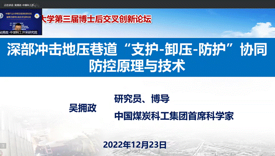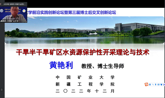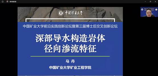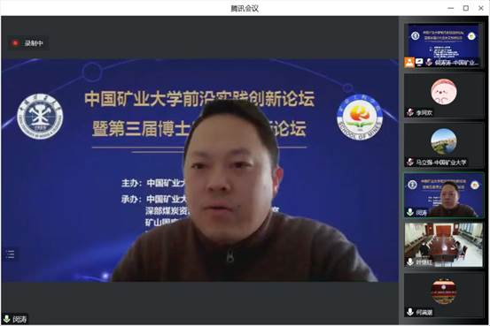 前沿实践创新论坛暨第三届博士后交叉创新论坛以线上方式召开。中国科学院院士、我院名誉院长何满潮教授,学校副校长叶继红教授,中国煤炭地质总局一级首席专家王佟工程师,中煤科工开采研究院有限公司副总经理吴拥政研究员,北京国华科技集团有限公司董事长王宏研究员,以及校人力资源部、矿业学科群7个学院的负责人、师生共计200余人参加会议。开幕式由学院党委书记闵涛主持。