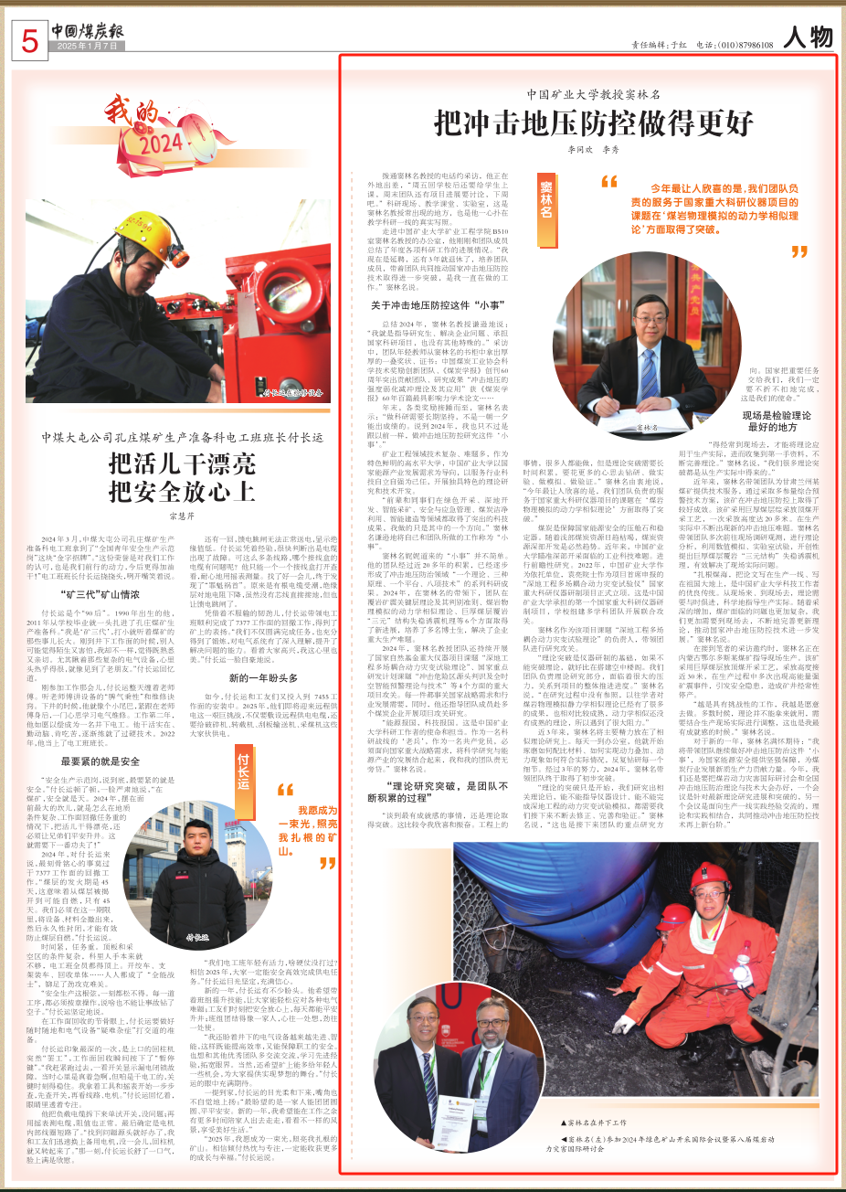 年末,各类奖励接踵而至,窦林名说到,“做科研需要长期坚持,不是一朝一夕能出成绩的。说到2024年,我也只不过是跟以前一样,做冲击地压防控研究这件‘小事’。”