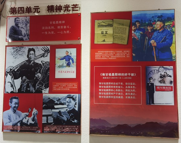 纪念馆分为上下两层,第一层为甘祖昌将军的赫赫功劳,第二层为龚全珍女士的生平事迹。首先参观第一层,第一层分为四个单元,分别是战争岁月、建设新疆、回乡务农、精神光芒,向我们展现了这位“将军农民”的伟大一生。甘将军在1927年加入中国共产党,从此投身红色革命的洪流之中。抗日战争时期,甘将军做好后勤工作,创造了一袋蚕豆走出草地的奇迹。开国后,甘将军建设新疆军区,鞠躬尽瘁之后主动回乡务农,成为了“将军农民”。之后参观第二层,第二层有四个展厅,展示了龚全珍女士的奉献一生。龚全珍女士是甘祖昌将军的妻子,她一生简单朴素,担任乡村教师。同时,她扶贫助学的公益爱心让无数人感动,也因此荣获“感动中国”2013年度十大人物。