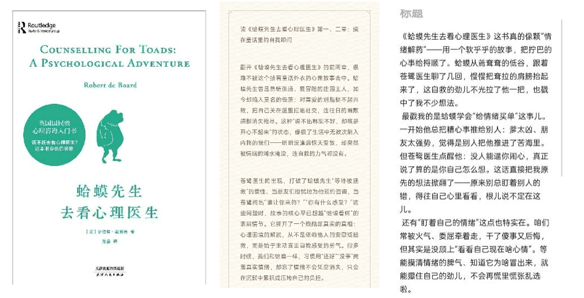 活动以经典心理学书目《蛤蟆先生去看心理医生》为核心,设置共读研讨、感悟分享等环节。参与者在线上围绕生命意义、自我成长等主题交流阅读心得,结合自身经历传递心灵力量,在思想碰撞中收获理解与支持,营造了浓厚的线上阅读氛围。